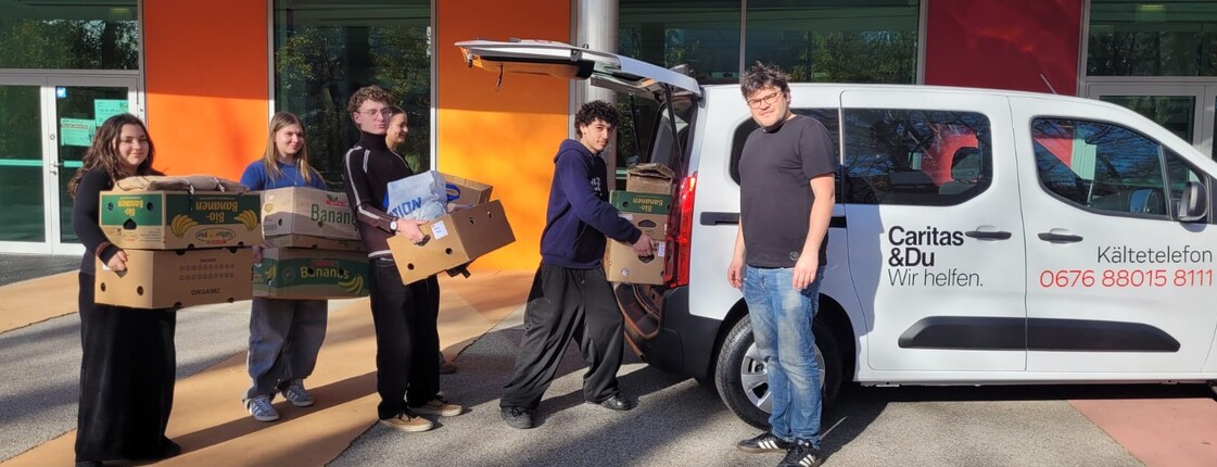 Die Ware wurde von unserem ehemaligen Schüler Jakob Url – er leitet nun die Bahnhofsmission – persönlich geholt. Er bedankte sich sehr für den Einsatz unserer Schüler*innen.