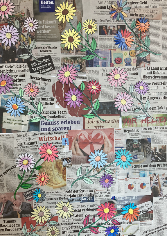 Die Schüler*innen sammelten Schlagzeilen, Bilder und kurze Berichte aus Zeitungen und Zeitschriften und klebten diese auf ein Plakat. Danach wurden bunte Blumen aus Papier bemalt und über die Nachrichten geklebt.
