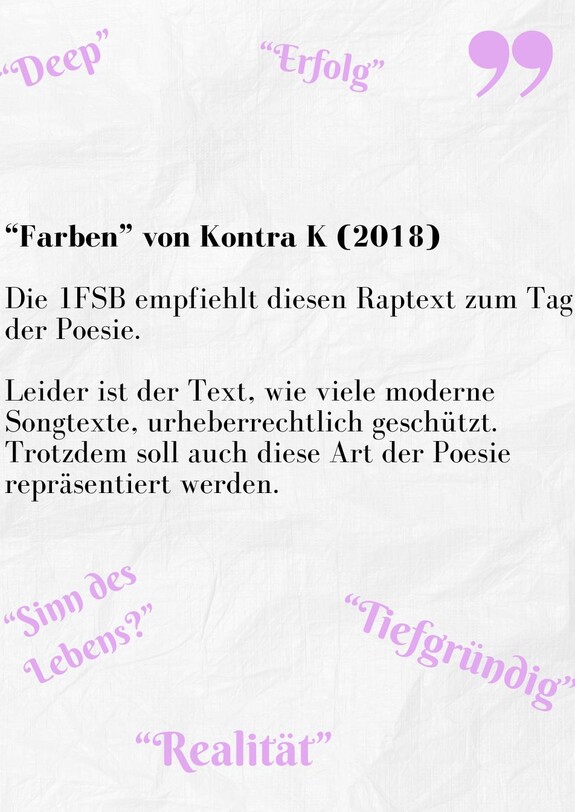 Anlässlich des Welttags der Poesie am 21. März hat sich die 1FSB intensiv mit verschiedenen poetischen Texten beschäftigt. Es wurde gelesen, nachgedacht, diskutiert und kommentiert – von klassischen Versen bis zu modernen Texten.