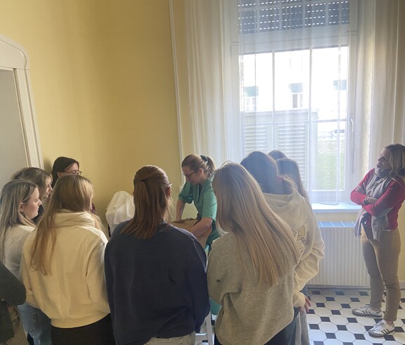 Frau Dr.in Kollmann erklärte auch die weibliche Anatomie, die unterschiedlichen Geburtsarten, die Risiken von Geschlechtskrankheiten und verschiedene Verhütungsmethoden. Außerdem führte sie die Schülerinnen durch die Universitätsklinik, wo sie wichtige Einrichtungen wie Hörsäle und Untersuchungsräume besichtigen konnten. Ein Highlight war die Möglichkeit, ein Ultraschallgerät auszuprobieren und bei einer nachgebauten Geburt zu assistieren.